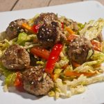 I saw a recipe for asian meatballs that got me thinking. It was on noodles which I didn’t want and had a sauce that was loaded with sugar. I decided to go my own way. I had a bunch of riced cauliflower left over and figured I’d give it a shot as a replacement for breadcrumbs in the meatballs. It worked out nicely! If you don’t want to rice a cauliflower just for this go ahead and use a 1/4 cup of breadcrumbs instead. This salad is a wonderful pile of contrasts. The dressing is sweet and tangy while the meatballs are savoury and spicy. The salad is cool and crunchy while the meatballs are warm and soft.