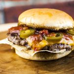 - Assemble burger bottom to top: chips, patty, jalapenos, chilli sauce