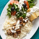 - Build a plate of salad, rice, souvlaki and potatoes. Liberally cover everything with tzatziki, feta and left over potato juices.